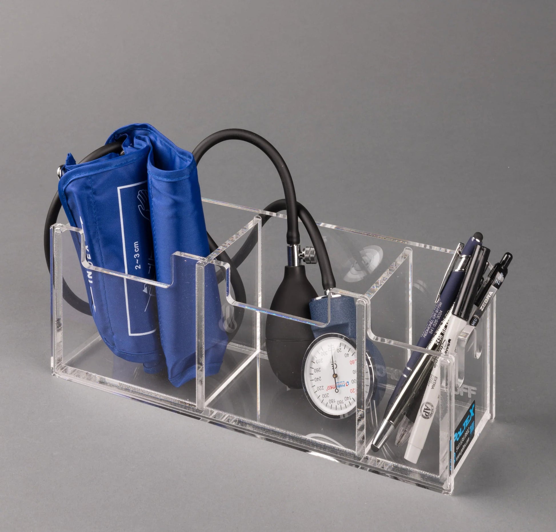 Organize common exam room items in this wall mounted unit to free up valuable counter top space to keep your exam room organized. Keep key patient care items in the right place at the right time, every time. Holds two rolled up BP cuffs and some writing implements. Wall Mount (screws and anchors included).
