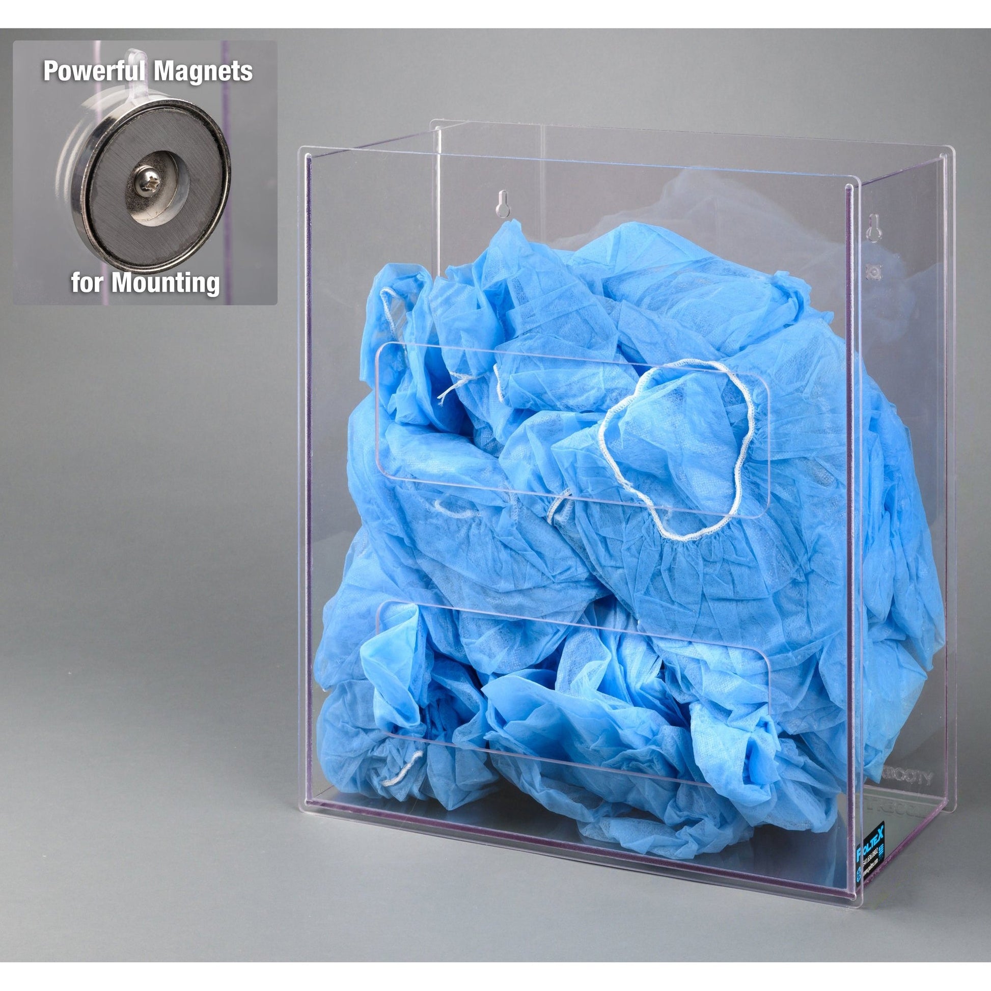Holds and dispenses bulk shoe covers (booties).  Constructed from super-durable PETG.  Two  slots for dispensing:  High and Low.