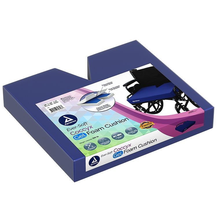 The Ever-Soft Gel Foam Coccyx Cushion is a high-density foam wheelchair cushion with an embedded dual-chamber gel-pod designed to help prevent and manage pressure injuries in wheelchair-bound patients. The contoured design reduces pressure from the coccyx, a high impact area prone to pressure wounds.