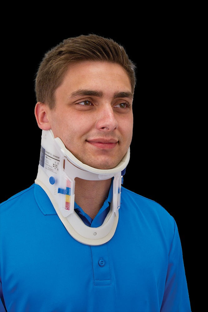 - Disposable, one-piece rigid collar restricts flexion, extension, and rotation