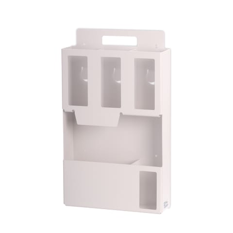 - Holds 3 boxes of exam gloves, 1 box of face masks, and several gowns