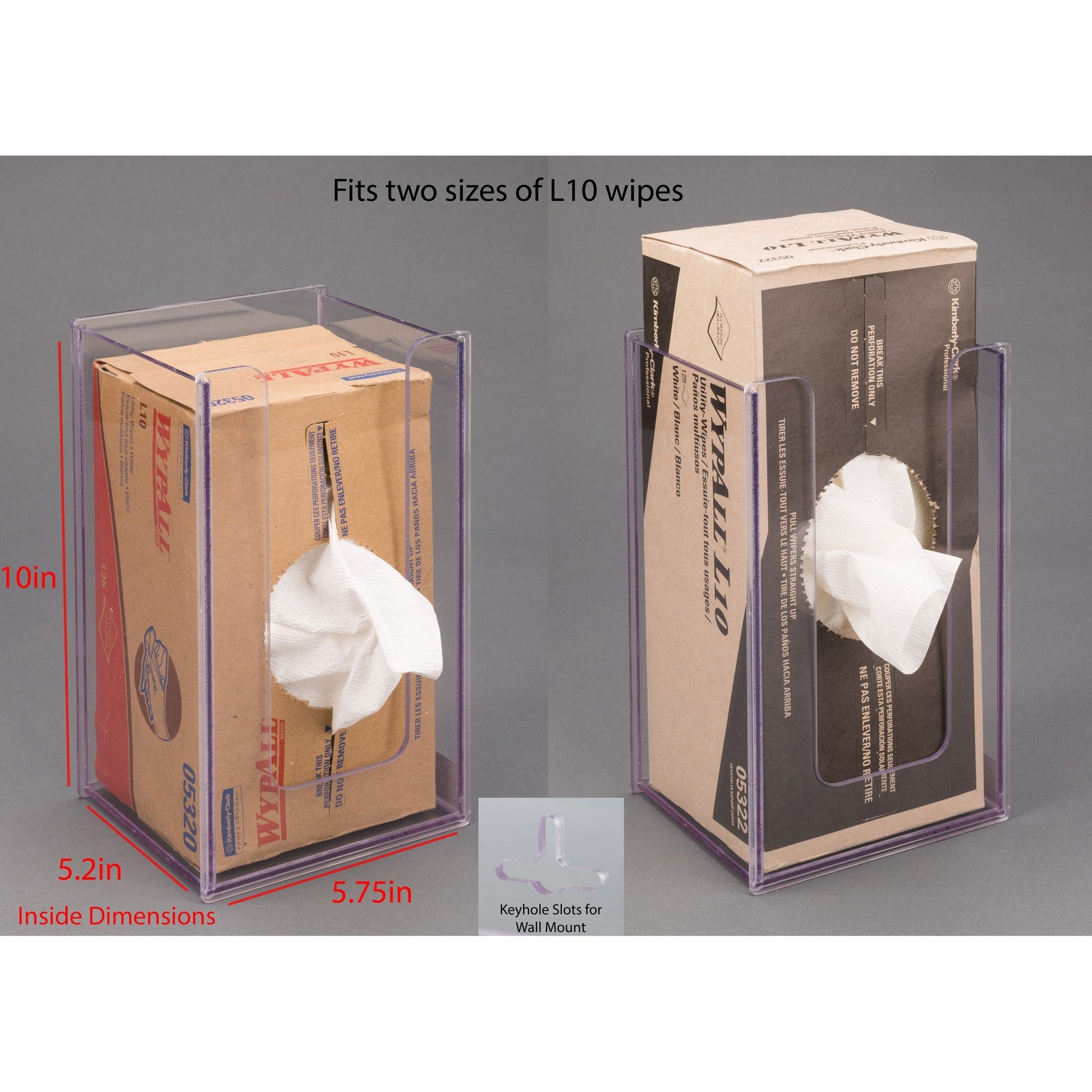 Holds one box of Wypall (05320 or 05322) or related products.  See image for dimensions. Durable PETG construction.  Mounts horizontally or vertically.