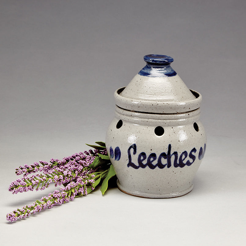 This handsome hand-thrown pottery borrows its design from the vintage 18" century leeches jars found so common in apothecaries. Like the originals, our modern version is perforated, lidded and bears the "Leeches" label in blue. Hand crafted in the USA using traditional methods and a salt glaze firing process. 6-1/2" tall in stand. |