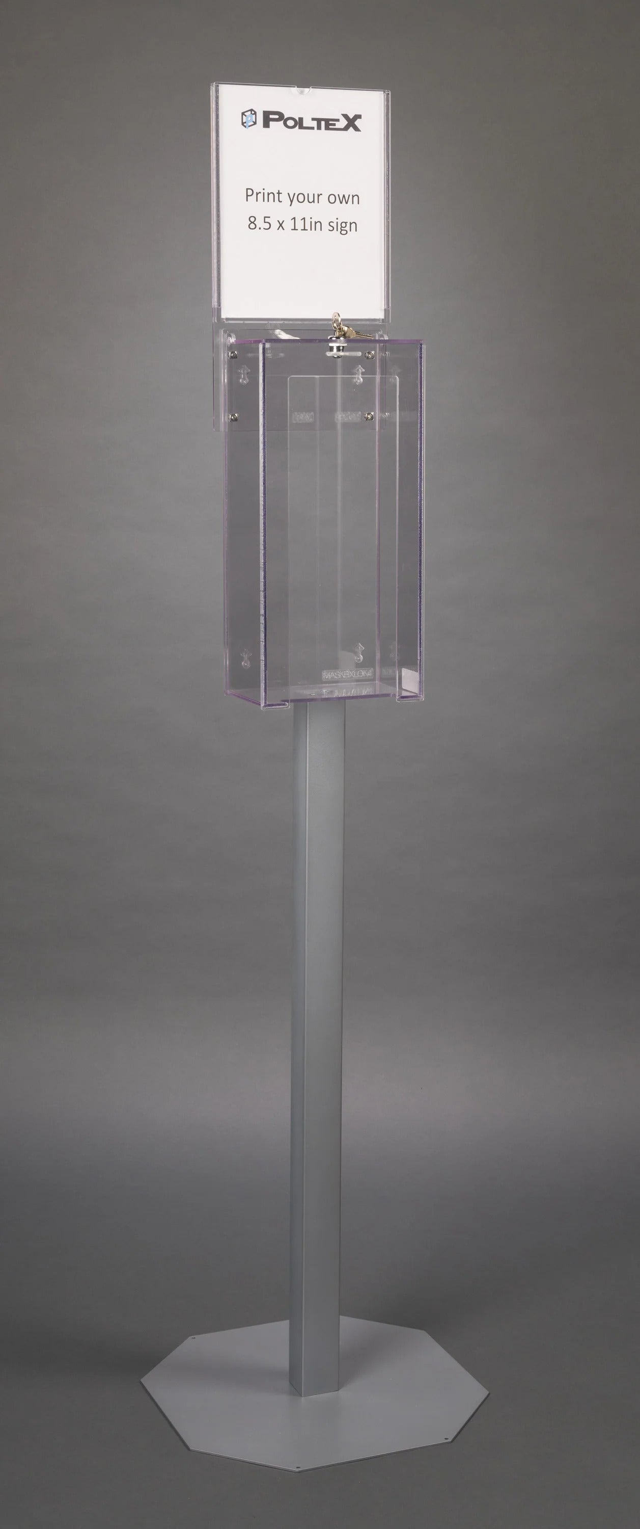 Holds a box of earloop masks. Key lock on top keeps contents secure. Durable clear PETG construction. SEE IMAGE FOR DIMENSIONS.