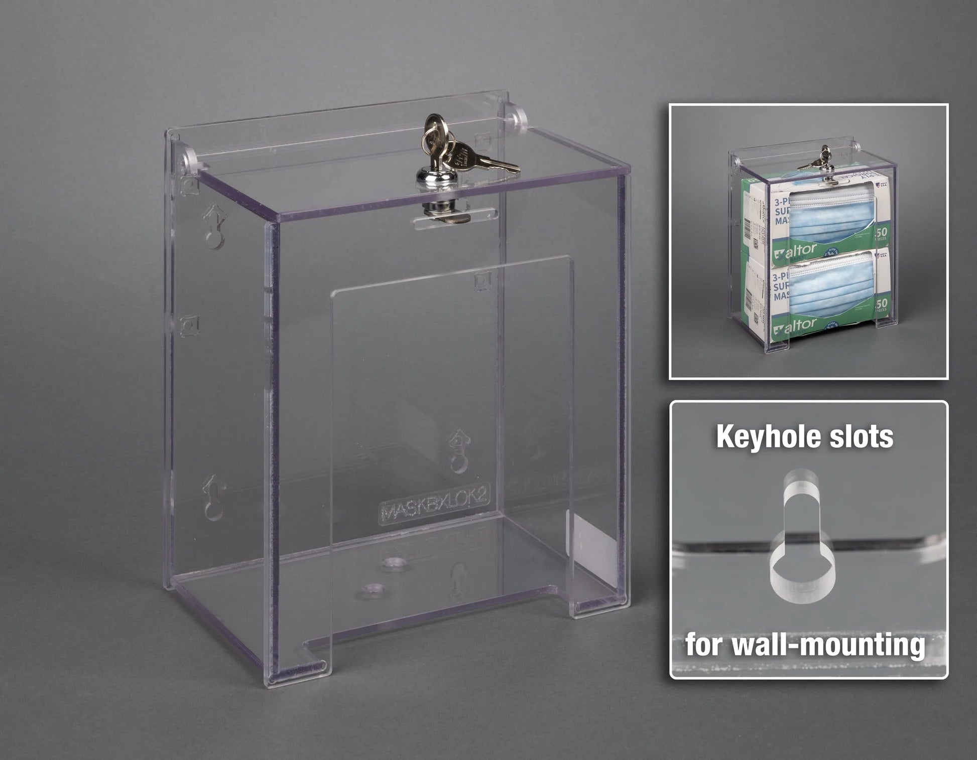 Holds a box of earloop masks.  Key lock on top keeps contents secure.  SEE IMAGE FOR DIMENSIONS.  Durable clear PETG construction.