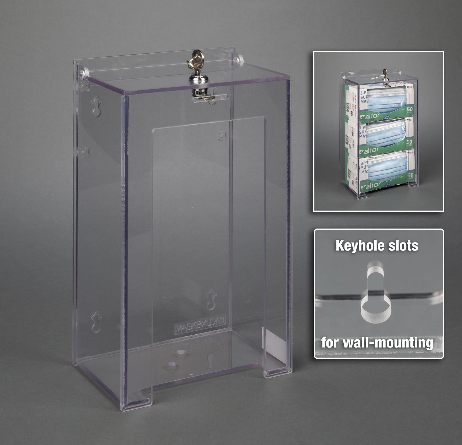 Holds a box of earloop masks.  Key lock on top keeps contents secure.  SEE IMAGE FOR DIMENSIONS.  Durable clear PETG construction.