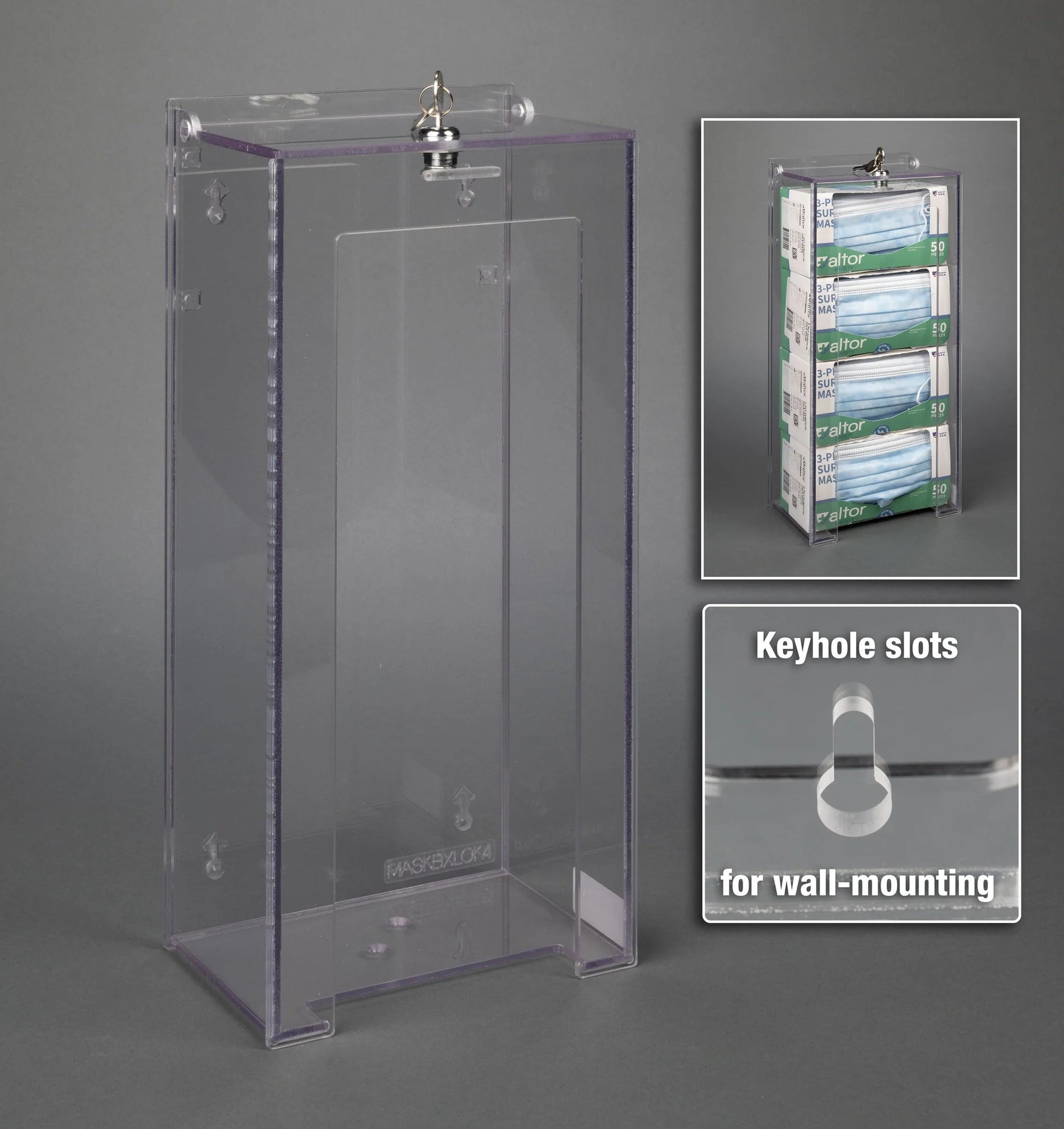 Holds a box of earloop masks.  Key lock on top keeps contents secure.  SEE IMAGE FOR DIMENSIONS.  Durable clear PETG construction.
