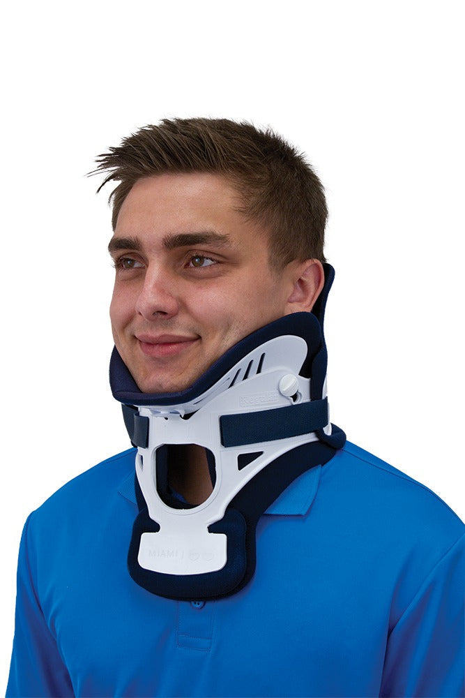 - Two-piece rigid collar restricts flexion, extension, and rotation