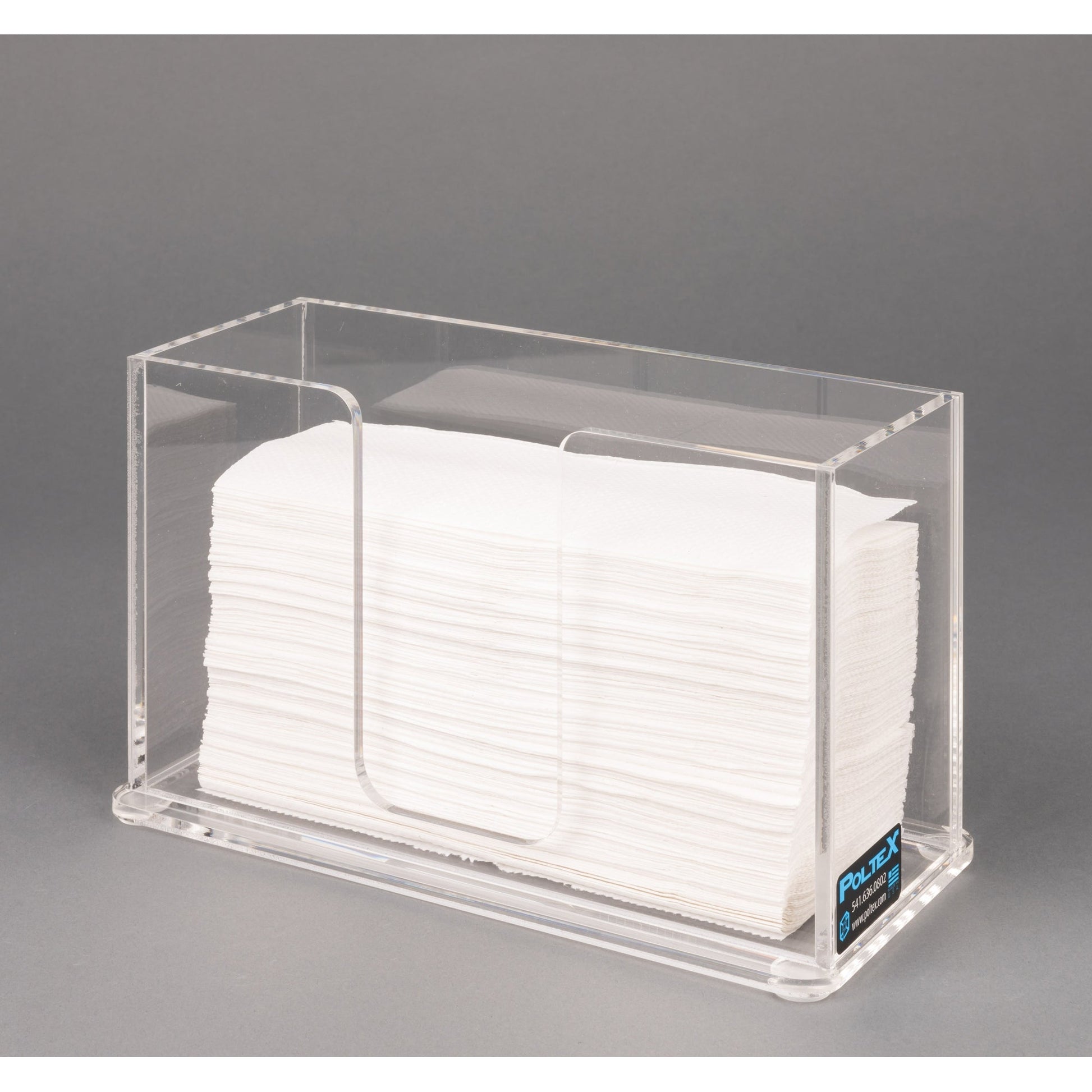 Clean and shiny acrylic dispenser sits on countertop.  Fits most common tri-fold towel brands