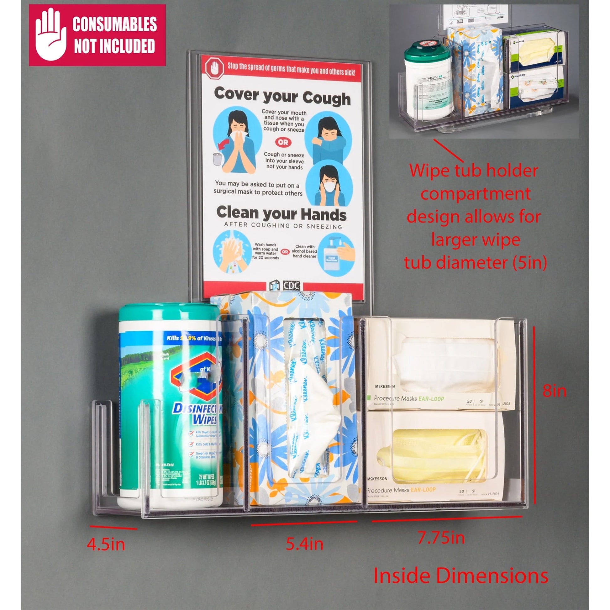 Our American made respiratory hygiene station displays a variety of consumables to help prevent the spread of infection in your hospital, clinic, workplace, office, restaurant, etc. Constructed from durable 1/4in thick PETG. Signs are removable if you do not need them