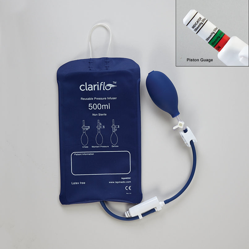 - Easy to Use - Needs minimal operator training. Piston gauge provides color-coded 360º visibility. Includes fluid bag hook, security clamp to close off air flow and IV pole loop with extended suspension and no-crimp tubing for hassle-free handling.