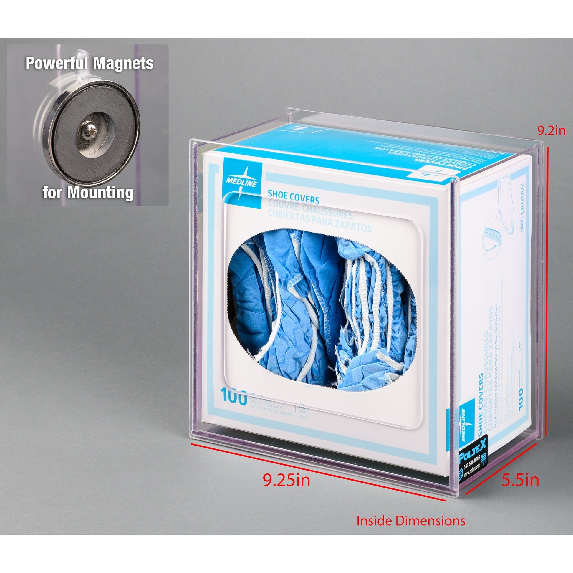 Holds and dispenses shoe covers. Mounts with opening on left, top, or right.