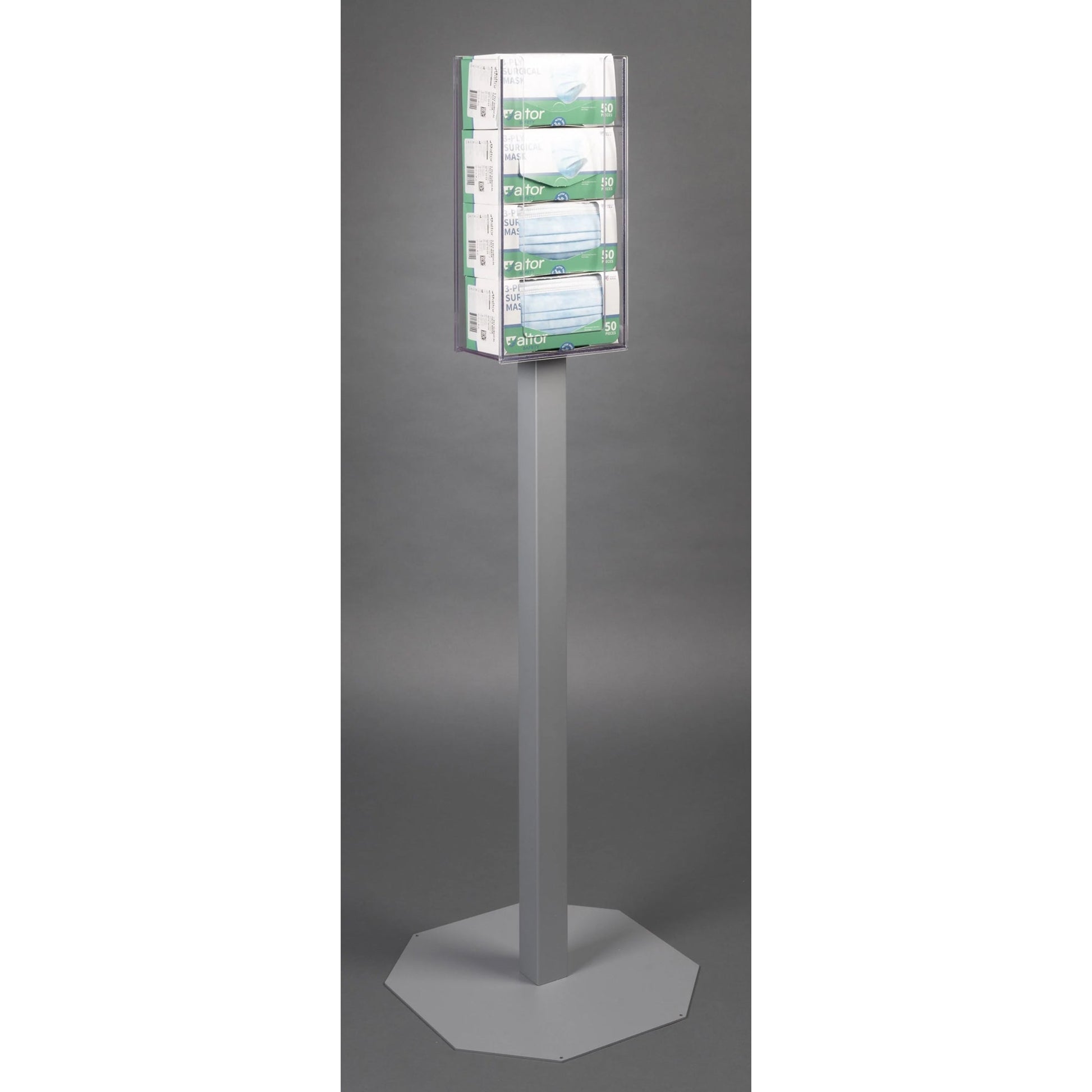 Holds and dispenses 4 or 8 boxes of earloop masks. Durable, cleanable PETG construction on a powder coated steel stand. SEE IMAGE FOR DIMENSIONS.