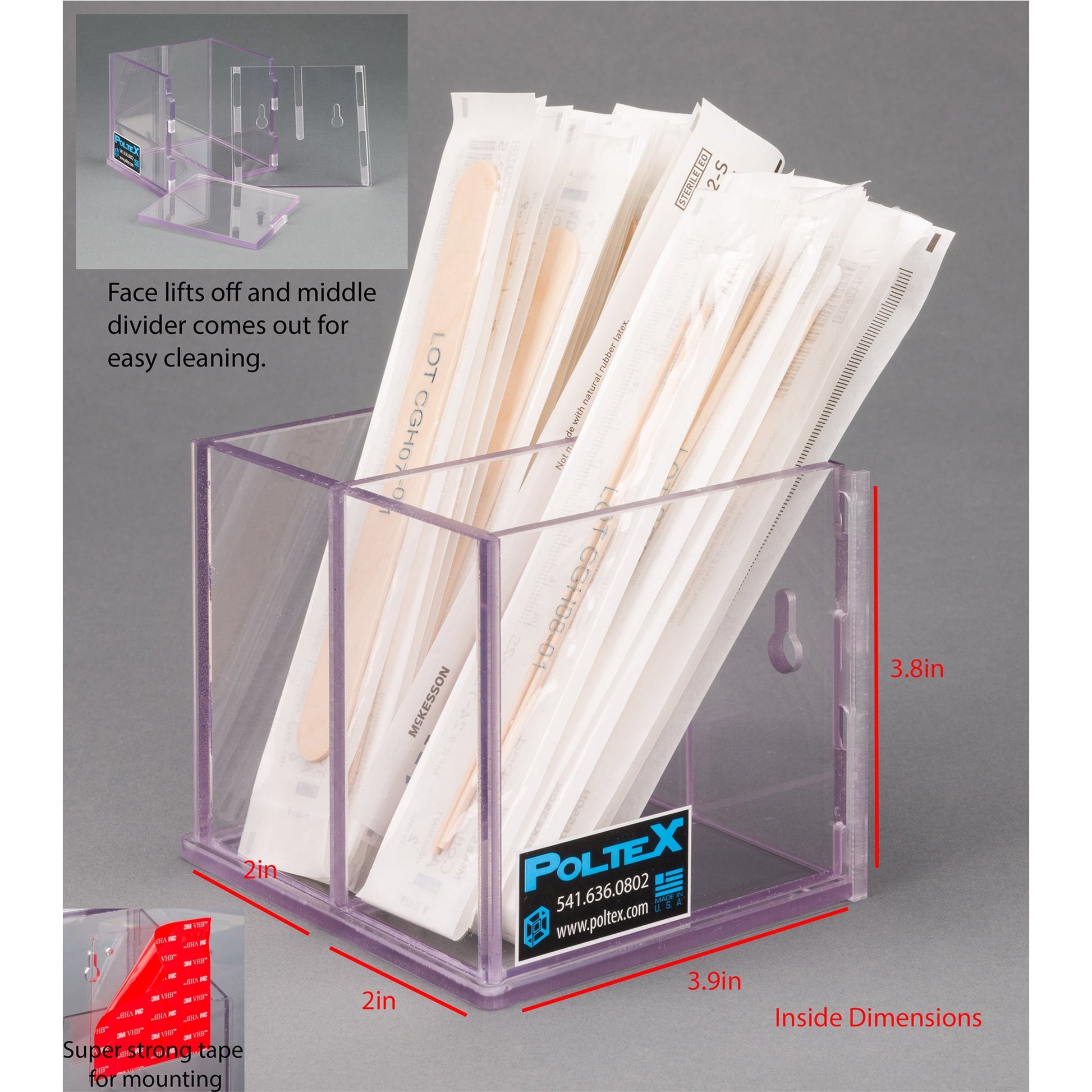 Two compartment holder keeps swabs and/or tongue depressors up and out of the way. Front face and middle divider lift off for easy cleaning. Choose from two attachment methods: VHB tape, or keyhole slots for wall mount