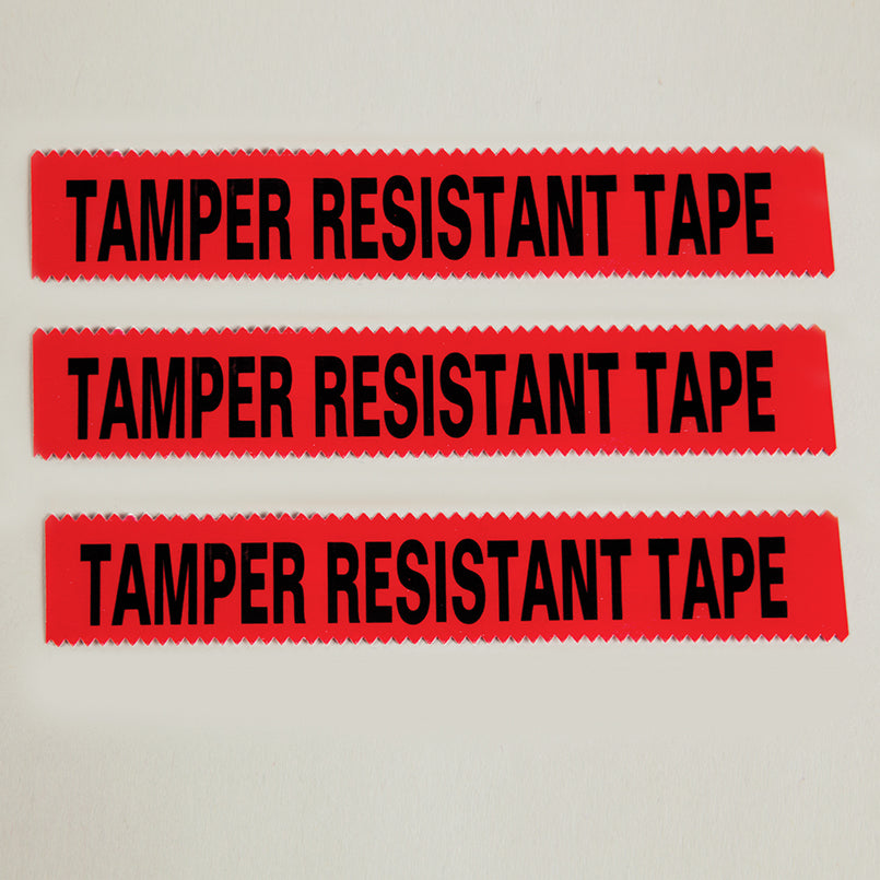 - Deters Tampering - Transparent Red polystyrene tape with serrated edges is printed with the message: "TAMPER RESISTANT TAPE" and will tear in small pieces to show evidence of tamper upon removal.