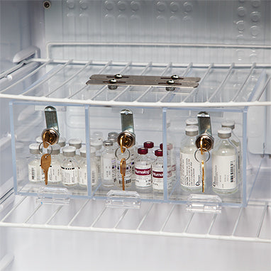 - Secure - Three lockable compartments on HCL s exclusive acrylic refrigerator box keep contents sorted and secure. Available in two locking styles: Key Lock or Dial Combination Lock. Compartments are keyed differently and include two keys per lock. Mounting hardware included.