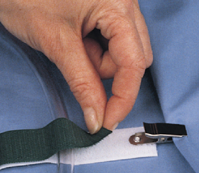 - Metal spring-loaded clip secures cord catch to bedding or surgical drapes