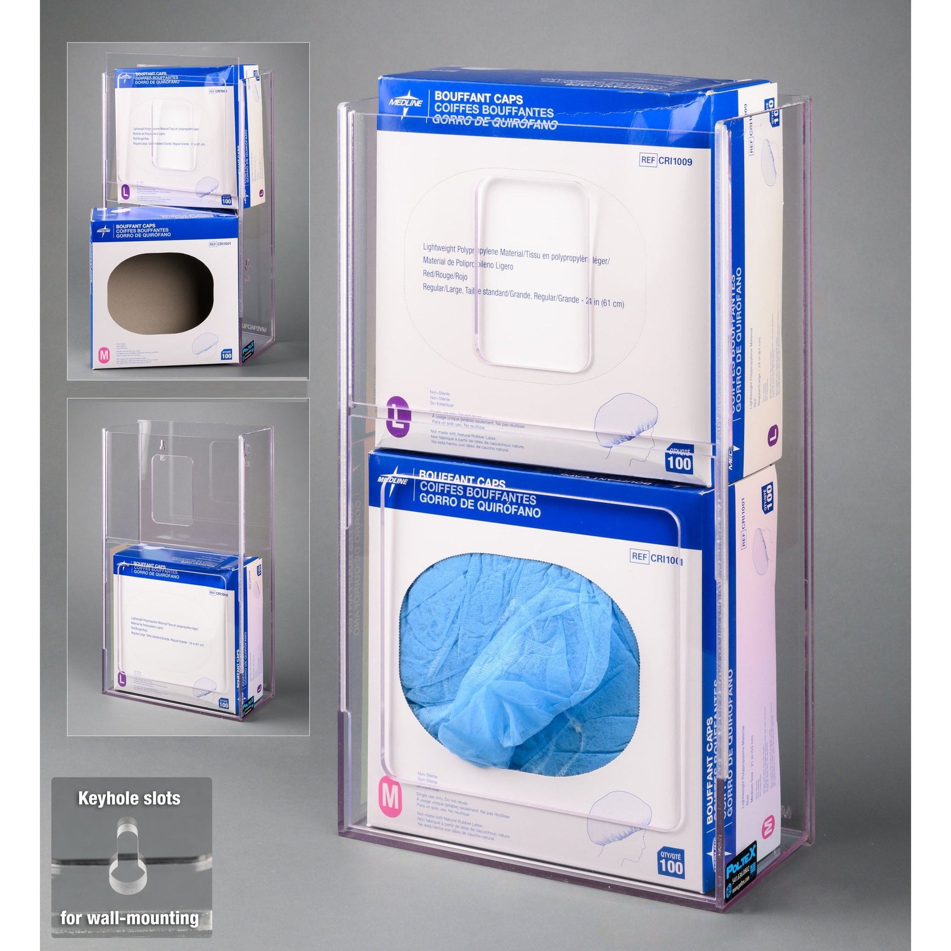 Constructed from super-durable PETG. Holds and visually manages two boxes of bouffant caps (one in use, and one back-up). When lower box is empty, front face lifts up and new box falls into place. Never be out when you really need a bouffant!