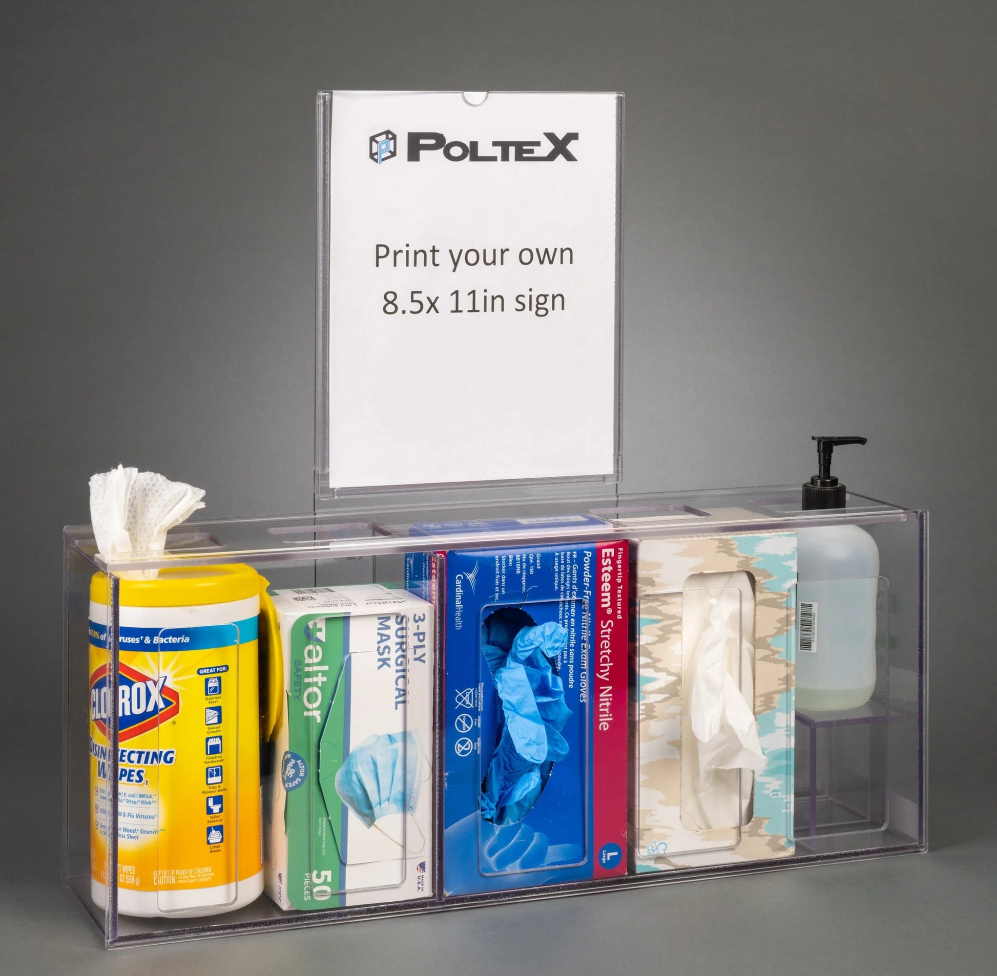 Sanitizing station with sign sleeve accommodates most combinations of sanitizing/infection prevention items on the market.  Choose from 4 or 5 item capacity.  Choose from wall mount (wall mount sign sleeve and mounting hardware included) or steel stand (durable powder-coated steel stand included).  Sliding lid locks with padlock (included) to prevent theft.  All keys are keyed the same.  Sign sleeve fits 8.5x11in sheet of paper.  Removable riser (included) can be 3 or 3.5in tall to accommodate different bottle heights.  Durable PETG construction.   See image for dimensions.